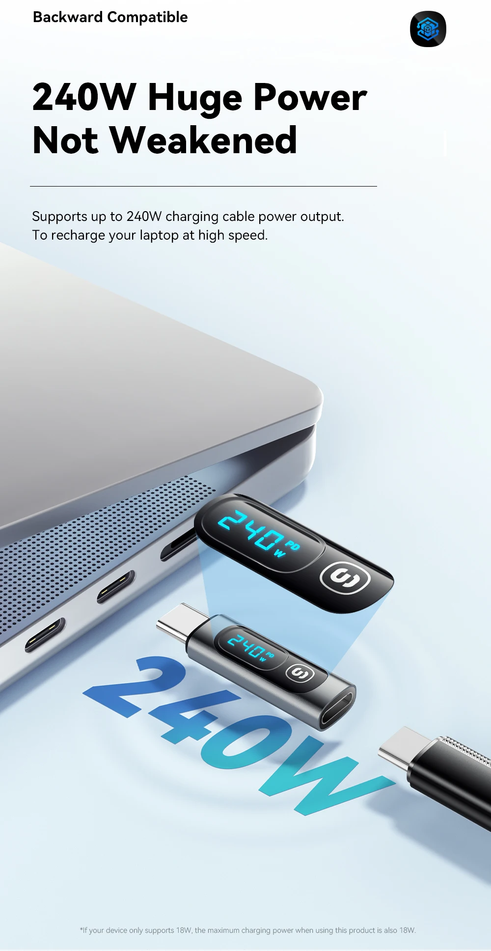 Az adapter támogatja a Power Delivery technológiát akár 240 watt teljesítményig, ami azt jelenti, hogy akár nagyobb teljesítményű laptopokat is képes gyorsan és biztonságosan tölteni és megjeleníteni a fogyasztásukat. Emellett az USB-C 3.0 szabvány lehetővé teszi a gyors adatátvitelt, így az adapter egyszerre töltésre és adatcserére is kiválóan alkalmas.