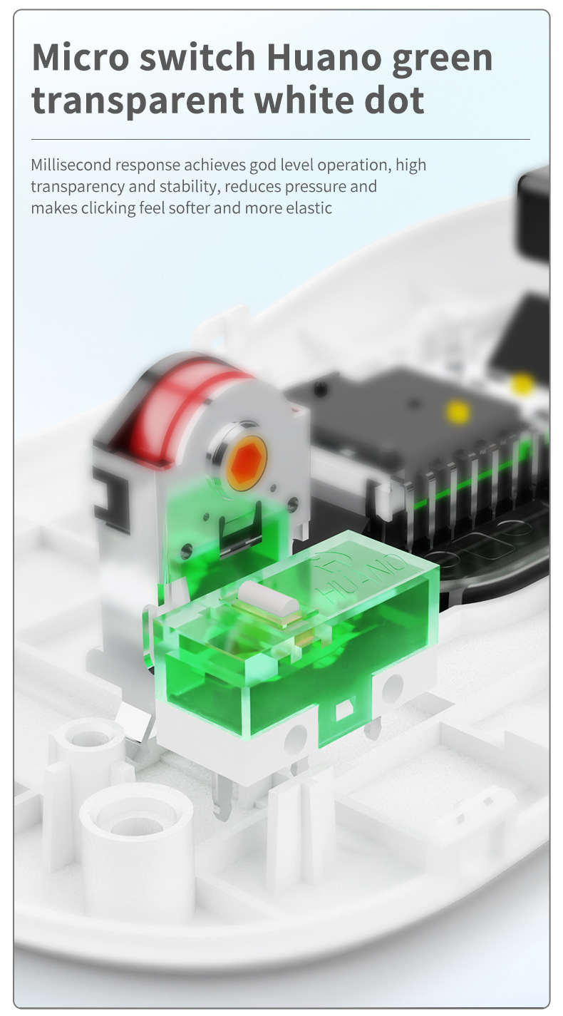 A kattintási mechanizmus Huano zöld mikrokapcsolókat használ, amelyek 100 millió kattintásra is tesztelve lettek. Ez nemcsak hosszú élettartamot, hanem megbízható és egyenletes működést is garantál. Az ilyen típusú kapcsolók különösen népszerűek a játékosok körében, mivel gyors és határozott visszajelzést adnak minden kattintásnál.