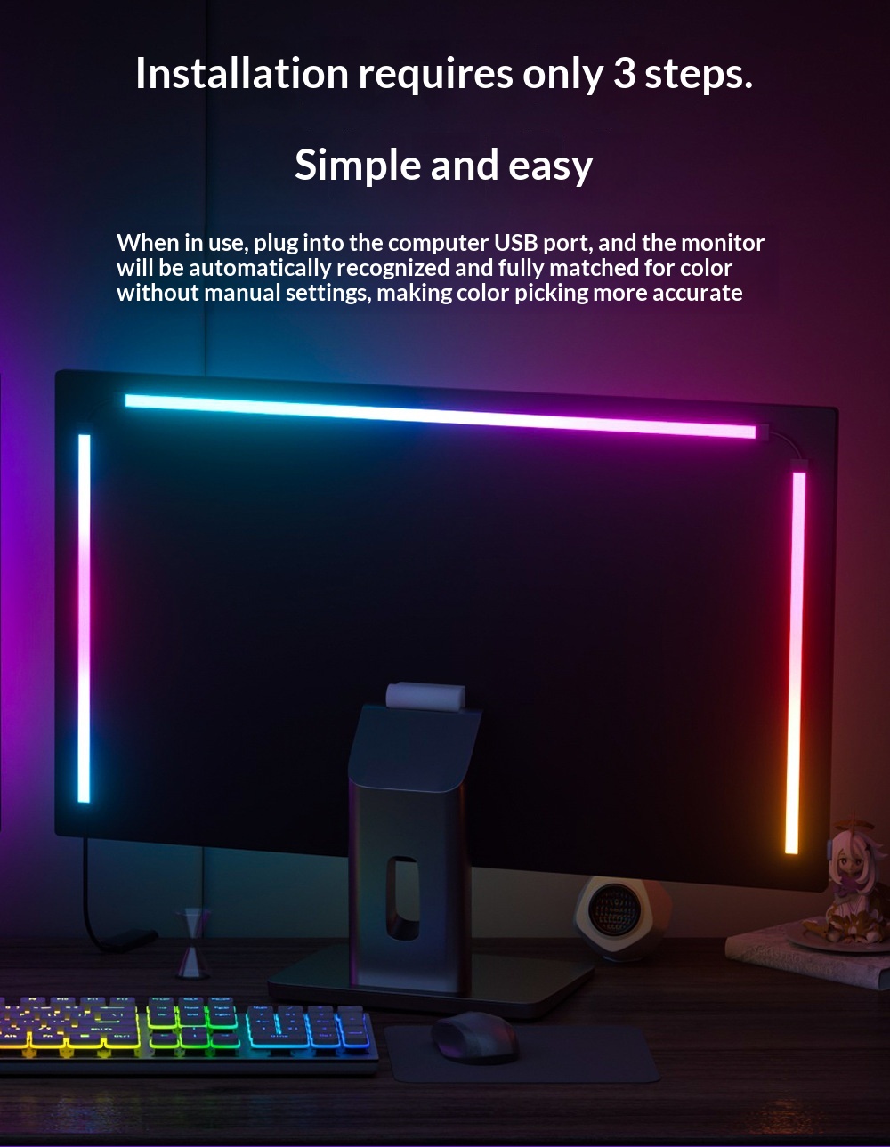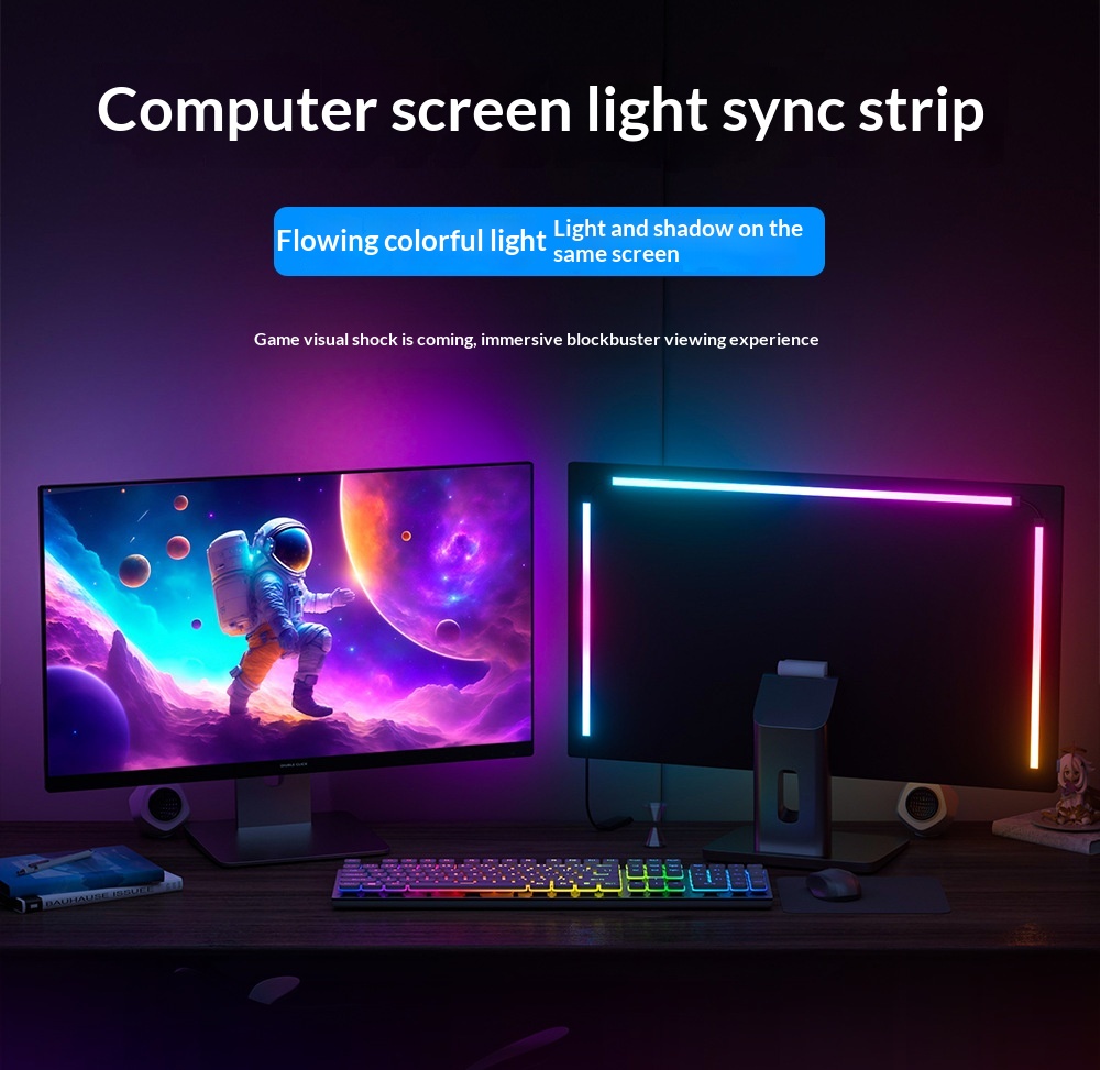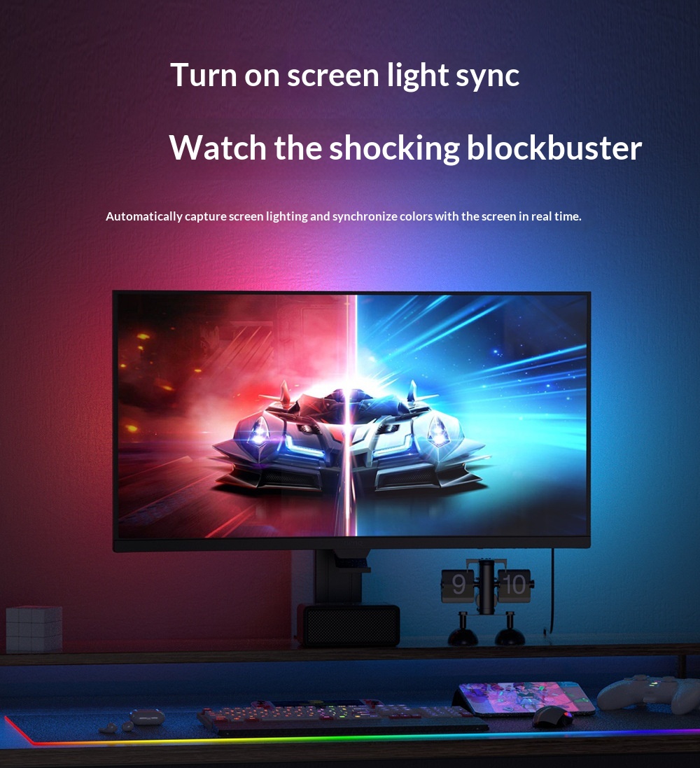 Az Elfeland RGB LED Light Bar egy olyan kompakt, a monitor mögött észrevétlenül megbúvó fényforrás, amely a kijelzőn megjelenő színhez igazítja a monitor mögötti fényeket.