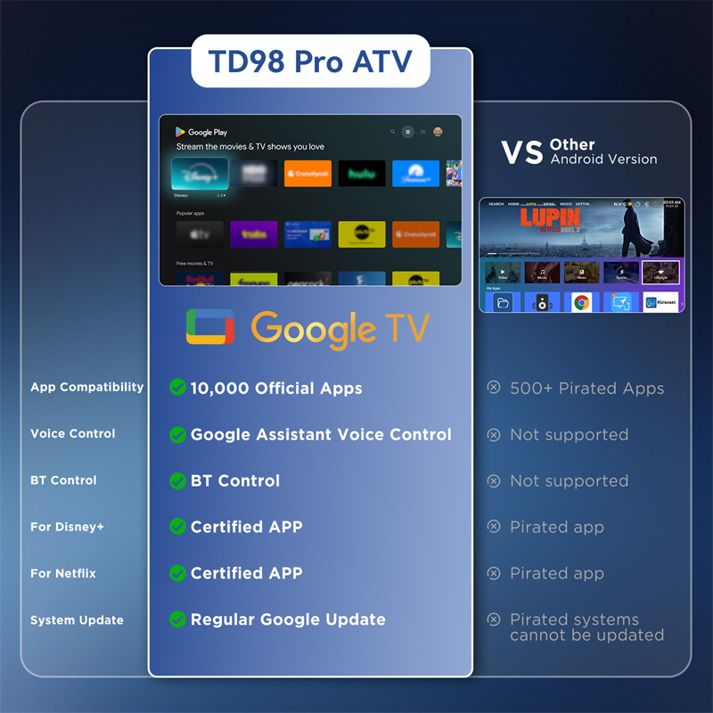 - Rendszer: Android TV (ATV, hivatalos licenc, Widevine L1), Google Asszisztens