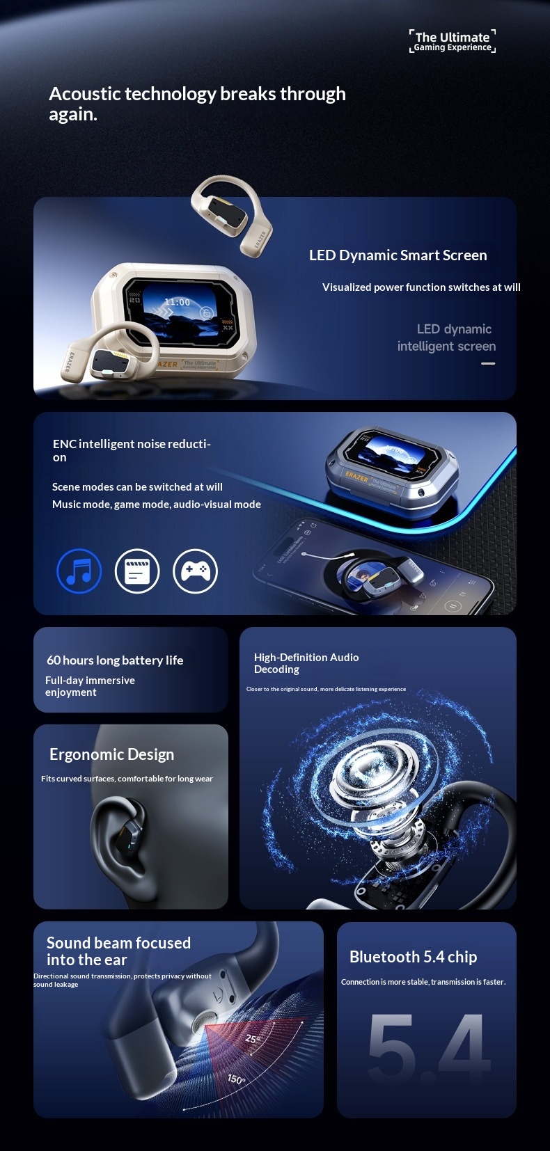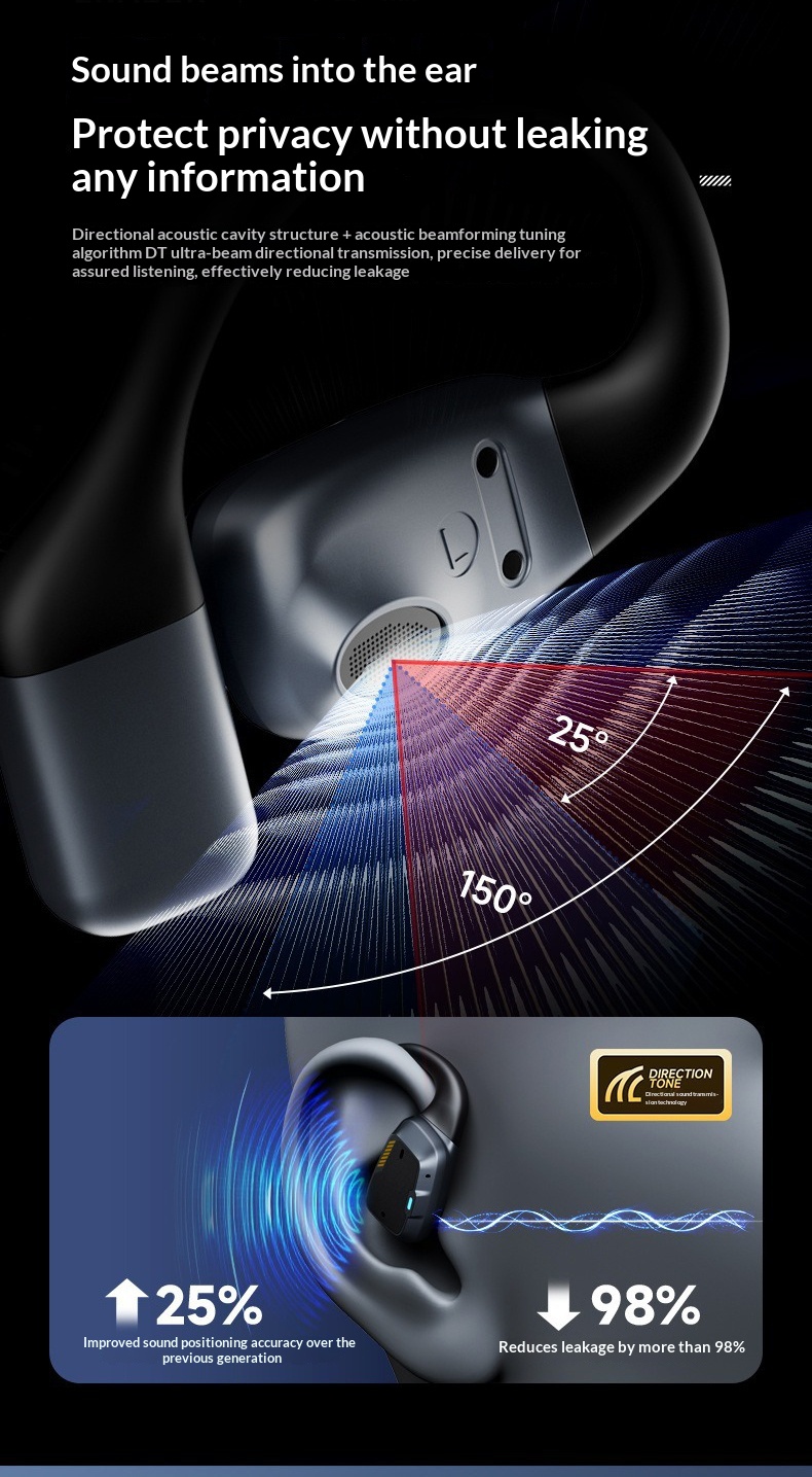 A modell alapját a Bluetooth 5.4 kapcsolat, a 13 milliméteres kompozit membrános hangszóró, valamint az ENC zajcsökkentés adja, amelyek együtt tisztább beszédhangot és stabil vezeték nélküli kapcsolatot biztosítanak edzés, vezetés vagy hétköznapi használat során. A nyitott kialakítású fülkampó nem zárja el a hallójáratot, így a környezet hangjai is érzékelhetők, ami sportolásnál kifejezetten előnyös. A gyártó 20-20000 Hz közötti frekvencia átvitelt, 16 ohmos impedanciát és -42 dB ±3 dB mikrofonérzékenységet ad meg, ami jól illeszkedik a kategóriás elvárásokhoz.