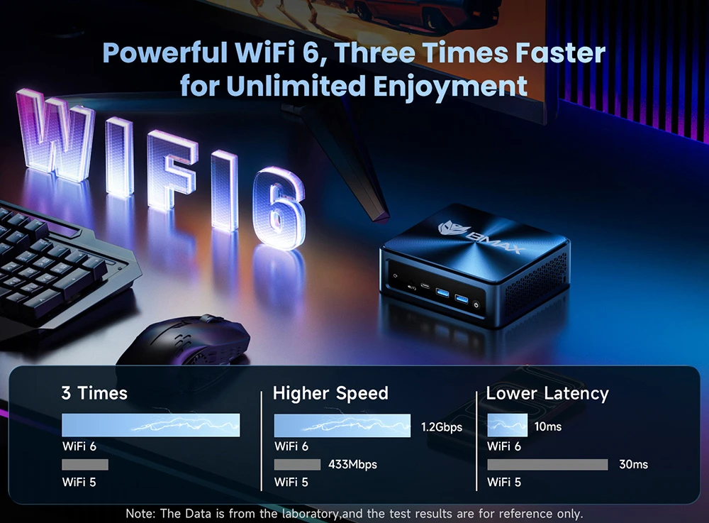 A csatlakoztathatóság terén is teljes a felszereltség, Wi‑Fi 6, Bluetooth 5.2, 2.5 Gbps LAN, négy USB‑port, HDMI, DP, Type‑C és 3,5 mm‑es jack csatlakozó áll rendelkezésre. A kompakt ház mindössze 126 × 112 × 52 mm, tömege pedig körülbelül 400 gramm, így könnyen hordozható és kis helyen is elfér. A rendszer előtelepített Windows 11-gyel érkezik, de teljes mértékben kompatibilis Linux disztribúciókkal (pl. Ubuntu) is.