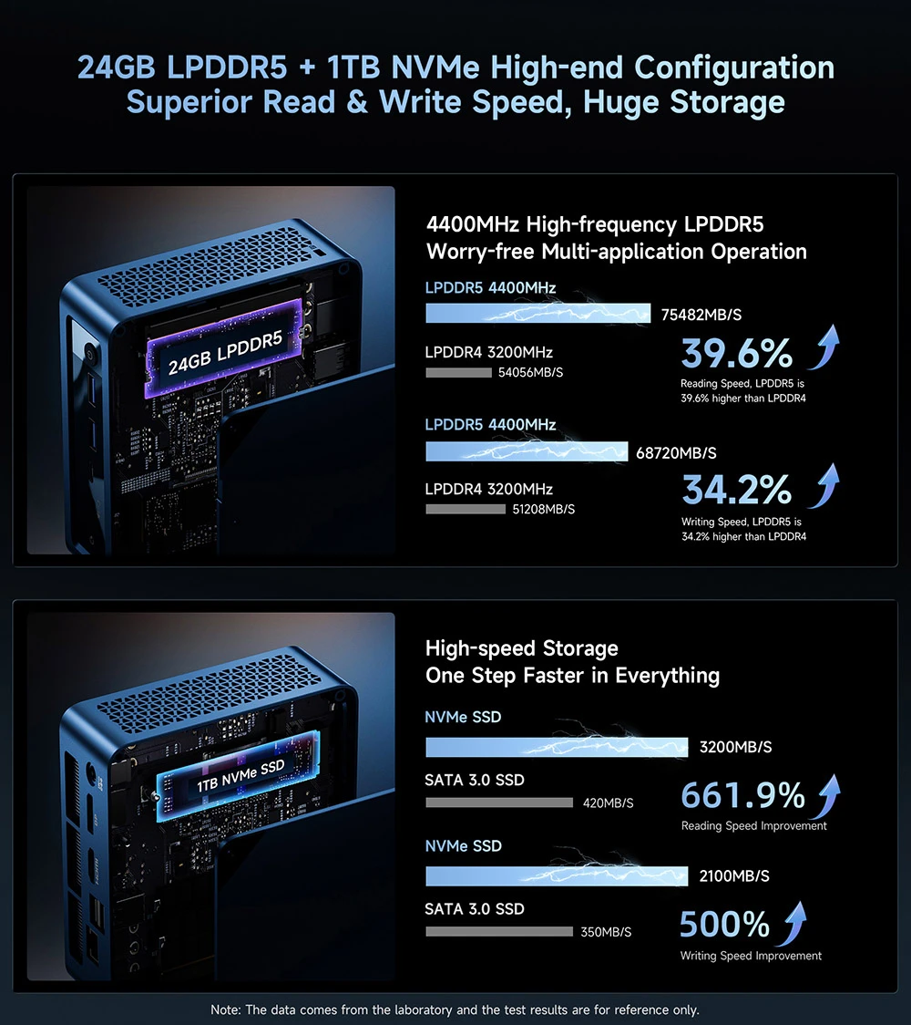A mini PC 24GB LPDDR5 (4400 MHz) memóriával érkezik, amely nagy sávszélességet és rendkívül gyors adatkezelést kínál, így egyszerre több nagy erőforrásigényű alkalmazás is gond nélkül futtatható. A tárhely egy 1TB kapacitású NVMe SSD, amely szükség esetén bővíthető, a készülék támogat egy további M.2 NVMe foglalatot, illetve egy 2,5″‑es SATA meghajtót, így akár több terabájtos konfiguráció is kialakítható.