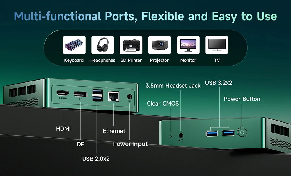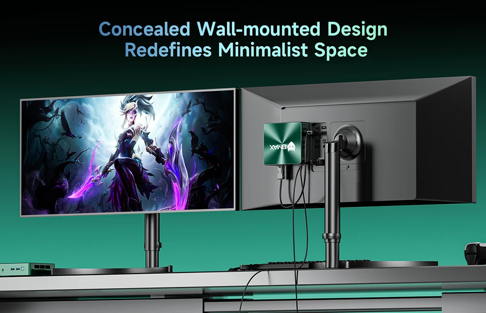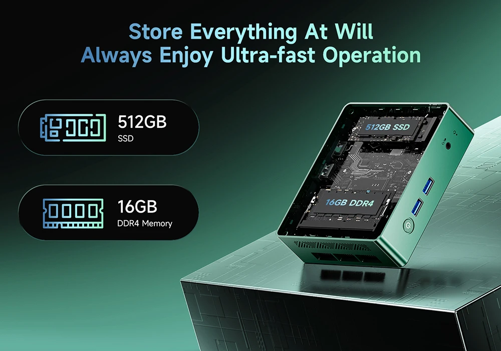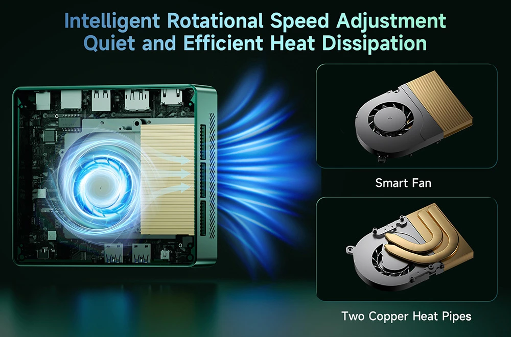 A készülék kiemelkedően kompakt, mindössze 112 × 125 × 33 mm, tömege 336 gramm, így könnyen hordozható és akár VESA konzollal monitor hátuljára is rögzíthető. A belső intelligens réz hőcsöves hűtőrendszer és a csendes ventilátor hatékony hőelvezetést biztosít, ami tartós terhelésnél is stabil teljesítményt eredményez. A Mini PC előre telepített Windows 11 operációs rendszerrel érkezik, és támogatja a Linux disztribúciókat is (Ubuntu kompatibilis).