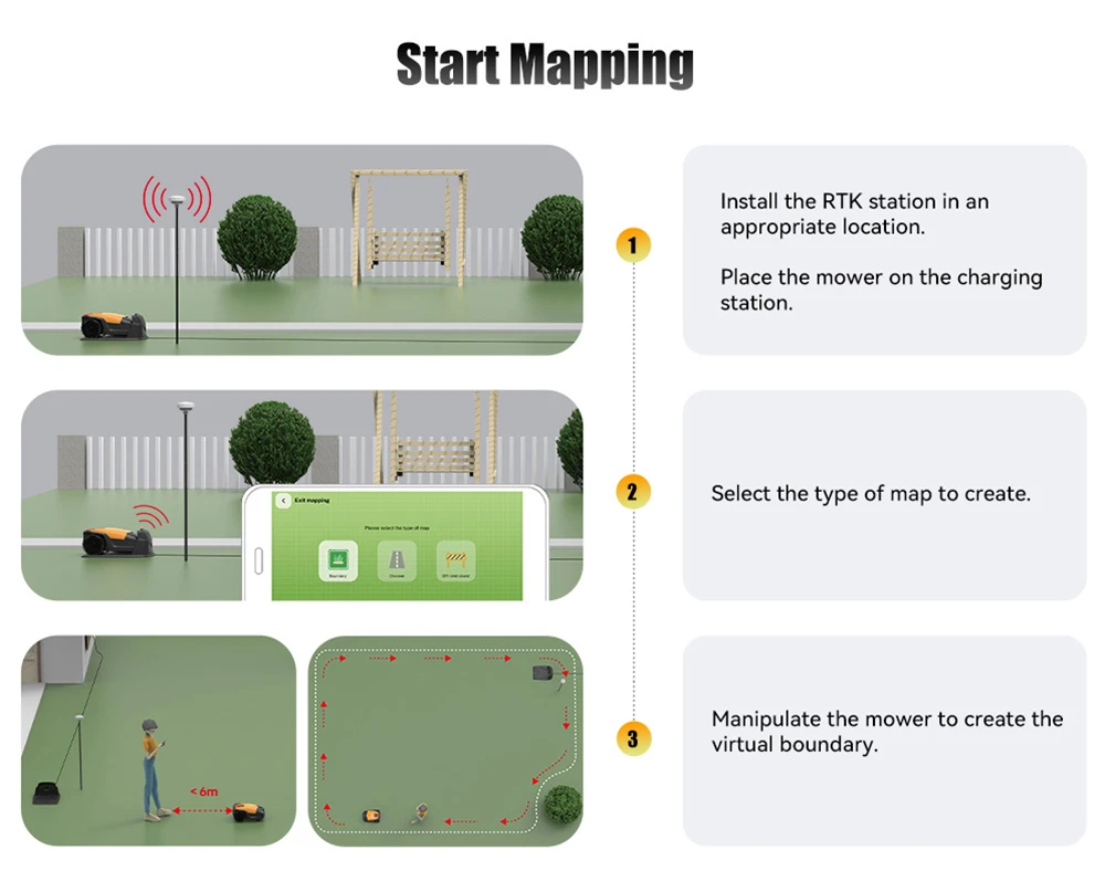 Az RTK + VSLAM alapú, több szenzort (RTK, kamera, ODO, IMU) egyesítő GFLS rendszer automatikusan elkészíti a munkaterület térképét, így vezetékfektetés nélkül, gyorsan üzembe helyezhető. A nagyjából 1500 négyzetméteres lefedhetőséghez 24 centiméteres vágásszélesség és 0,4 méter/másodperc körüli haladási sebesség társul, a vágásmagasság 25 és 65 milliméter között, motoros állítással szabható testre, így a gyors, egyenletes nyírás mellett a gyep igényéhez igazítható a megjelenés.