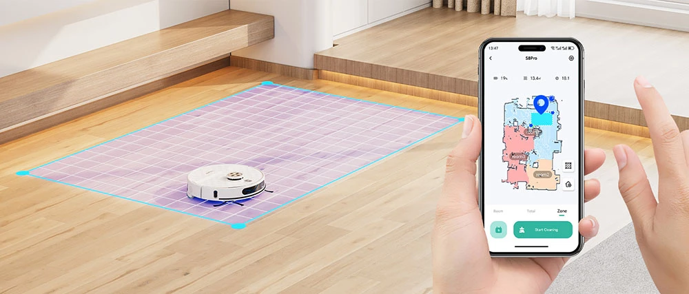 Felmosáskor elkerüli őket, porszívózáskor automatikusan emeli a szívóerőt, hogy a szálak közül is kihúzza a port és a szőrszálakat. A gyártói adatok 6000 pascal maximális vákuumot és akár 240 perces működést adnak meg egy feltöltéssel, ami 180 négyzetméter körüli alapterületekhez is elég – régiótól függően elérhető 8000 pascalos variáns is, amely még keményebb felületű szennyeződésre lett hangolva. Az S8 Pro több térképet tud megjegyezni, a takarítást időzítheted, Alexa/Google hangvezérléssel indíthatod, és az alkalmazásban könnyen kijelölheted azokat a helyiségeket, ahol aznap alaposabb körre van szükség.