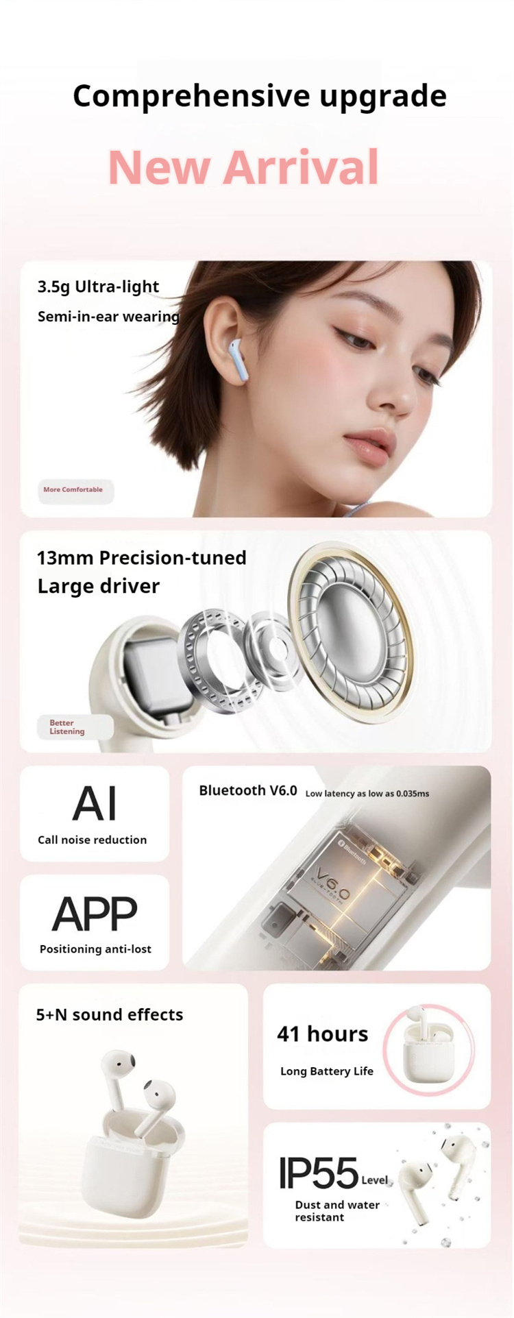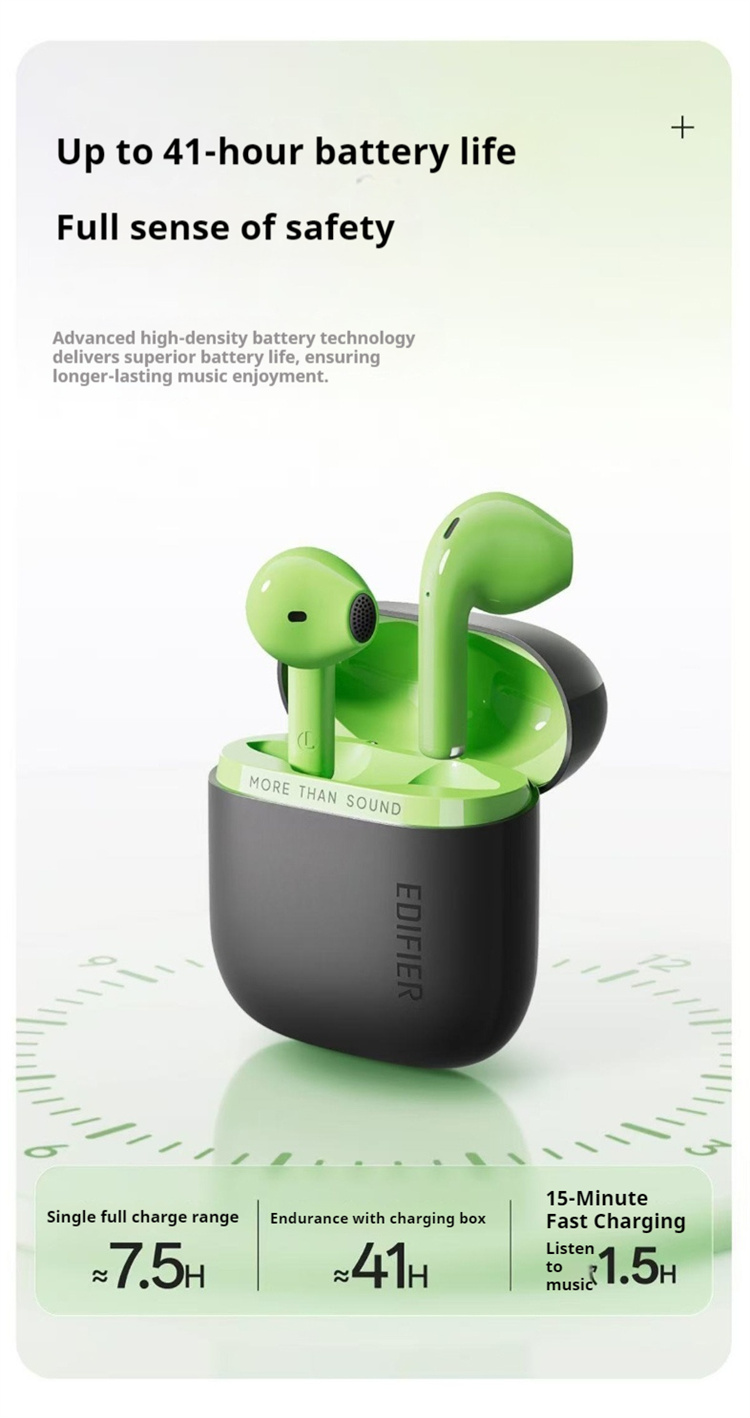 A gyártói leírás 41 órás üzemidőt említ tokkal, ami a napi ingázás és a hosszú munkaórák mellett is bőséges tartalék, a „low‑latency” mód pedig videónál és játéknál is jobb szinkront ad a kép és a hang között. IP55 minősítéssel víz és porálló, így edzéshez vagy esőben sétához is vállalható, a vezérlés érintésalapú, a csatlakozás gyors, a bluetooth szabvány V6.0‑ként szerepel a termékoldalon, ami egyszerű párosítást és stabil kapcsolatot jelent a hétköznapokban.