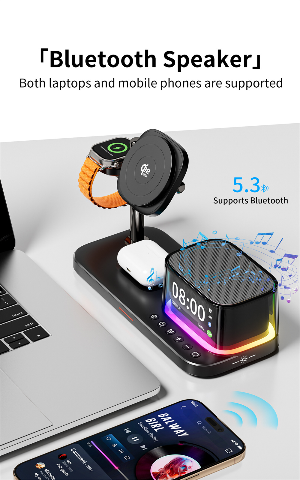 A beépített Bluetooth hangszóró tisztán, a kategóriához képest dinamikusan szól, ezért a reggeli hírek vagy a kedvenc podcast közben sem kell plusz kütyüt bekapcsolnod, az állítható dőlésszögű fémkar pedig úgy tartja a telefont, hogy videóhíváskor is kényelmesen csekkolhasd az értesítéseket, miközben tölt. Az USB‑C tápbemenet 15 volt 3 amper igényt jelez, a telefonoldali vezeték nélküli teljesítmény 5/7,5/10/15/25 watt, az AirPods felület 5 watton működik, az óra töltő 1-3 wattot ad, a rádiós rész Bluetooth 5.3, az egész ház pedig egy letisztult, RGB fényű éjjeli módot is tud, ha épp csak hangulatfényt szeretnél.